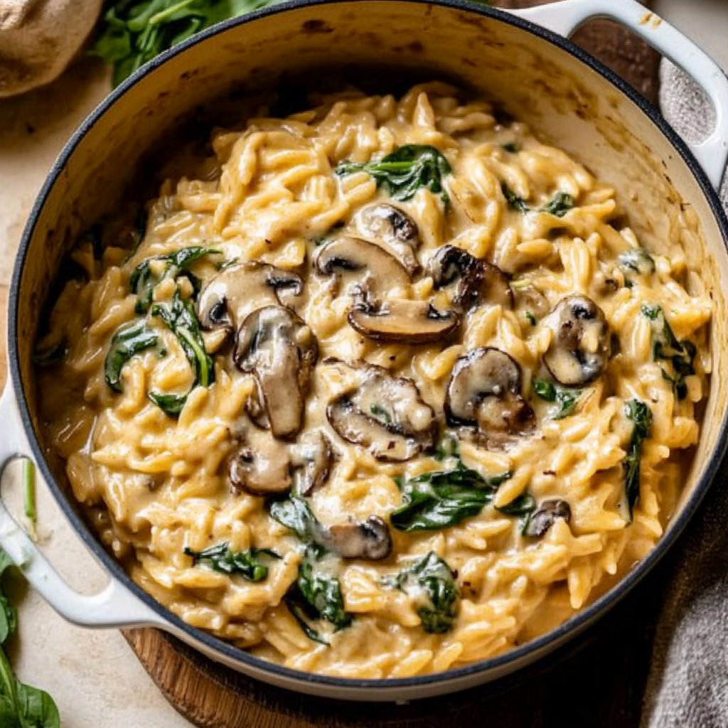 Start by sautéing the mushrooms and garlic until fragrant, then add the orzo along with broth. Stir in spinach just before serving for a fresh finish.