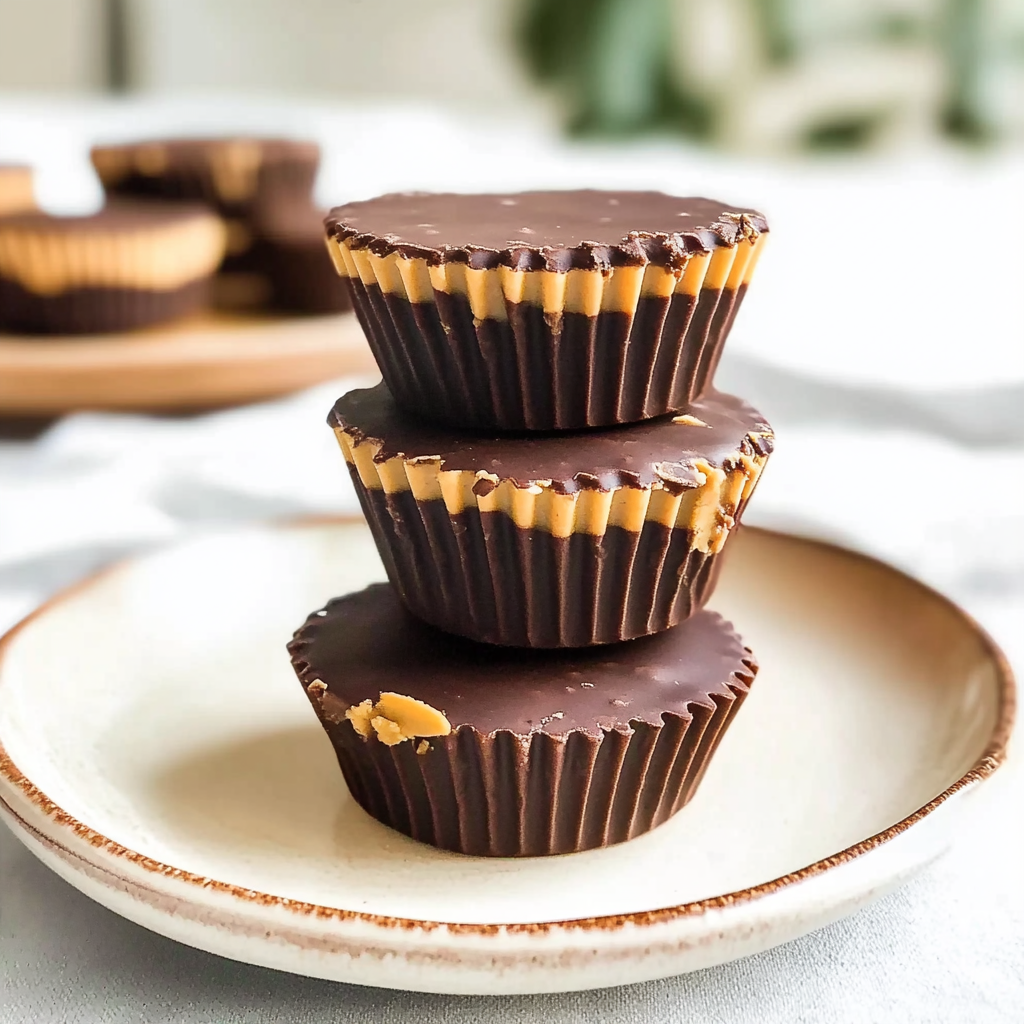 Add the Peanut Butter Filling: In another bowl, mix natural peanut butter with honey or maple syrup until well combined. Scoop about a tablespoon of this mixture into each mold on top of the chocolate layer.