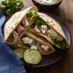 Assemble the Pitas: Warm pita bread slightly in a dry pan or microwave so it’s pliable. Fill each pita generously with sliced chicken and top with fresh vegetables—don’t be shy here!